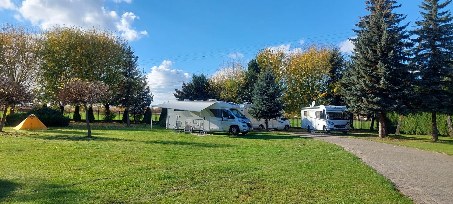 Pole namiotowe mieści się w rozległym ogrodzie obok budynku Centrum.