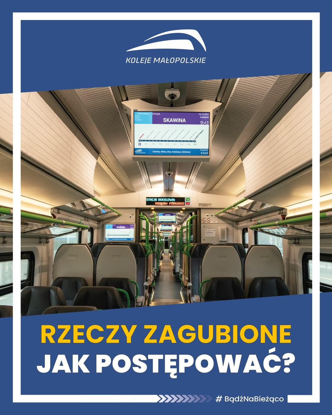 Rzeczy znalezione w pociągach Koleje Małopolskie przekazywane są do punktu przechowywania rzeczy (czynny od 7:30 do 15:30 w dni robocze od poniedziałku do piątku - nr tel. 727 440 020).