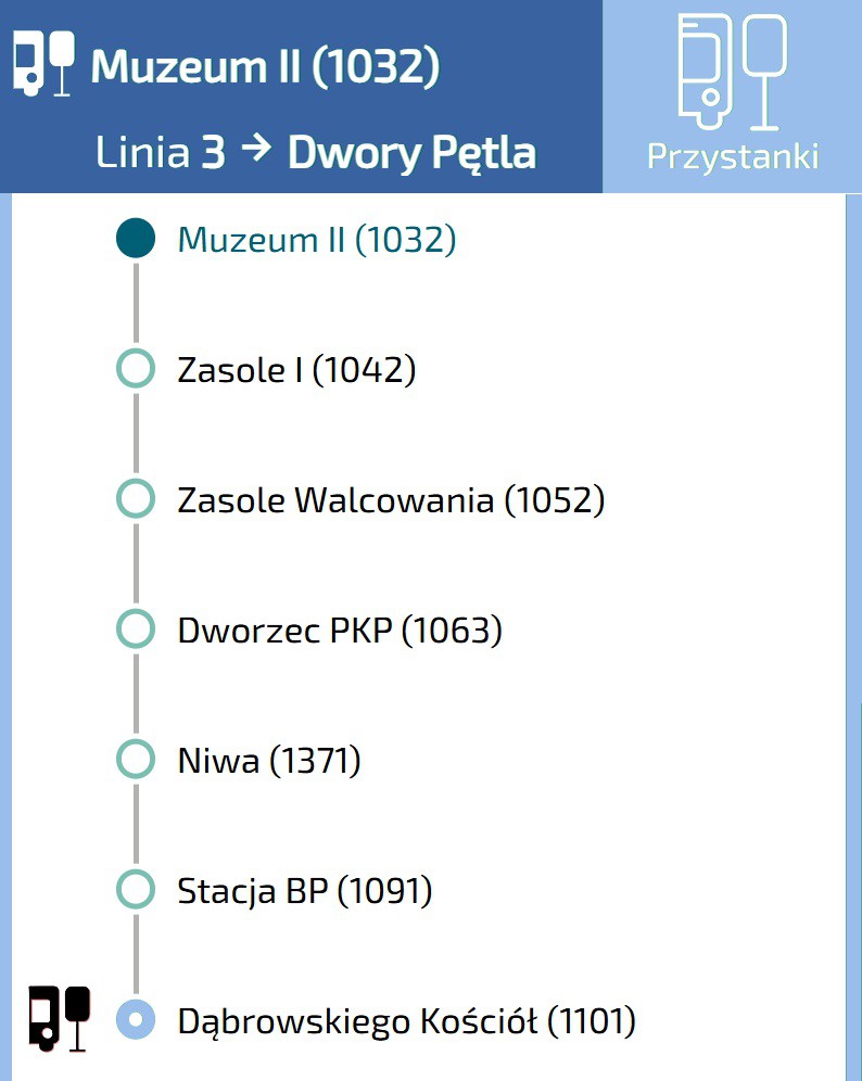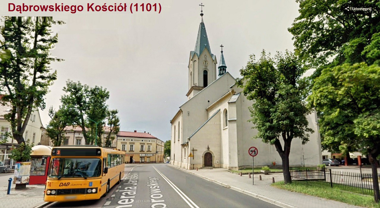 Należy wysiąść na 3 przystanku „Dąbrowskiego Kościół”