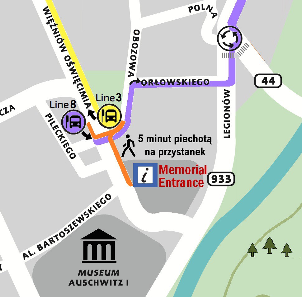 W odległości 350 metrów od parkingu Muzeum Auschwitz znajdują się dwa przystanki autobusowe Miejskiego Zakładu Komunikacji: